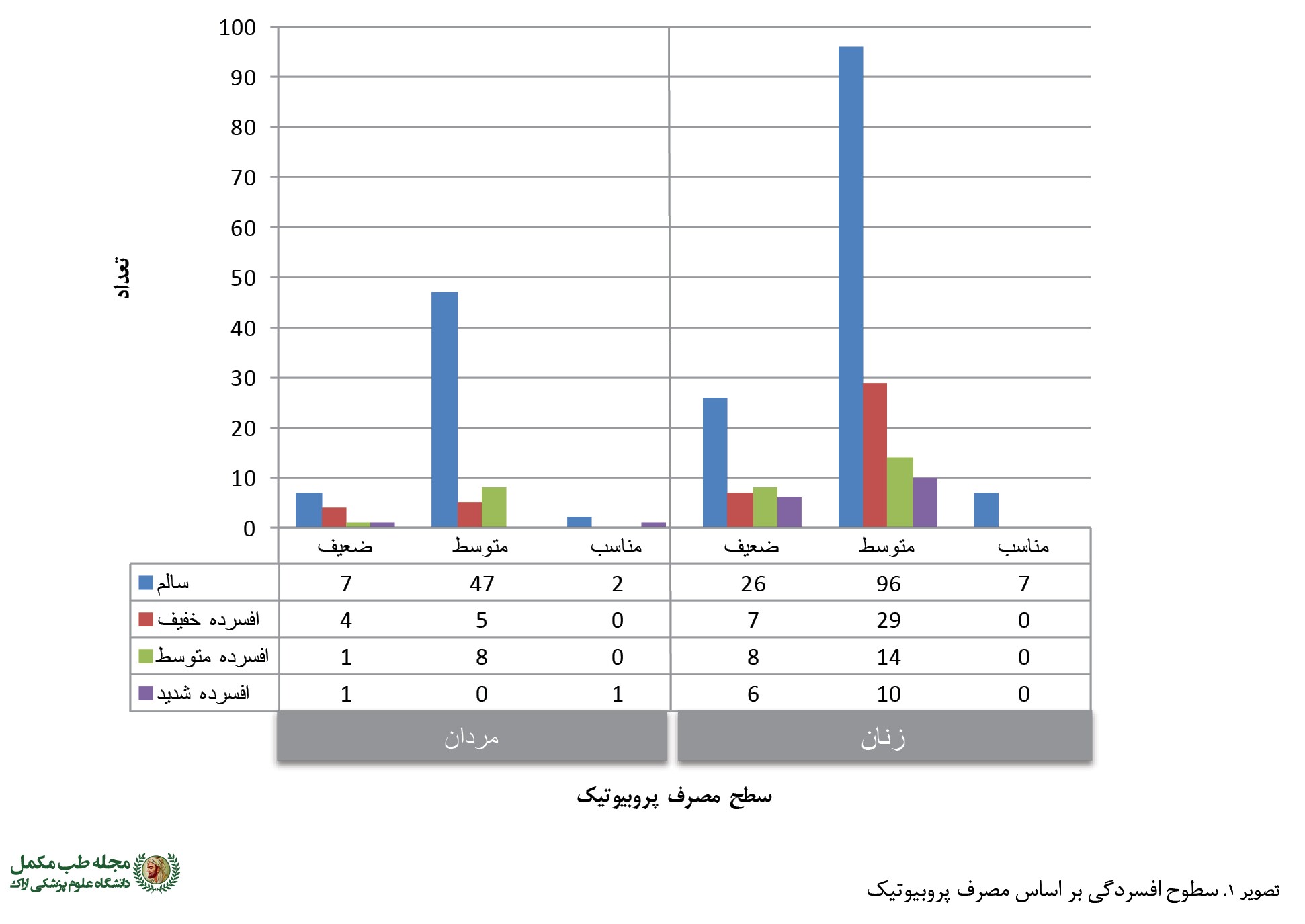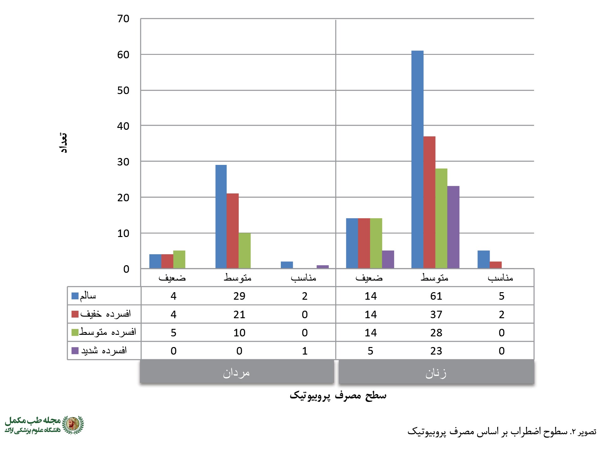 تصویر شماره 1 توصیف سطوح مصرف پروبیوتیک (ضعیف، متوسط و مناسب) و سطوح شدت افسردگی (سالم، خفیف، متوسط و شدید) شرکتکنندگان در پژوهش و
